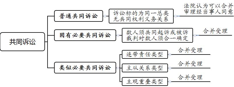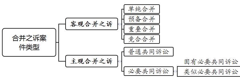结合司法实践的实际情况,常见合并之诉案件主要包括诉的客观合并和诉的主观合并(共同诉讼)。诉的客观合并主要包括单纯合并、预备合并、重叠合并以及竞合合并。共同诉讼包括普通共同诉讼和必要共同诉讼,必要共同诉讼包含固有必要共同诉讼及类似必要共同诉讼。