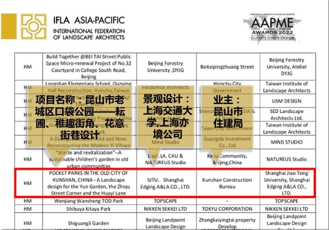 IFLA AAPME Awards是由国际风景园林师联合会IFLA亚太地区与IFLA非洲和中东地区合作组织的一项国际性设计奖项。2022年该奖项主题为“气候危机设计”,共设有文化和传统、经济活力、洪水和水资源管理、自然灾害和极端天气、能源和碳减排、社会和社区健康、分析和规划等10个类别奖项。