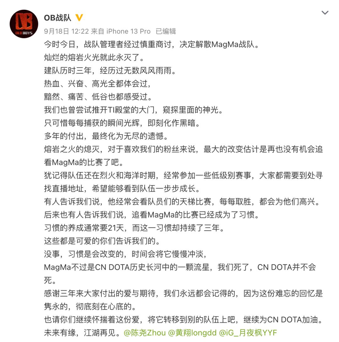 OB战队发布公告,表示战队管理者经过慎重商讨,决定解散MagMa战队。