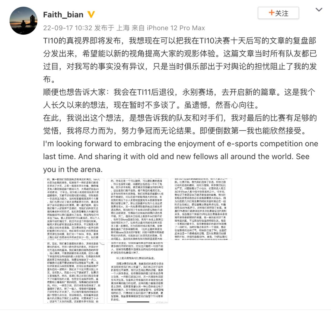 根据Faith_bian的个人微博,由于TI10的真视界即将发布,他将TI10决赛后的复盘内容发出,是“希望能以新的视角提高大家的观影体验”。在微博中他也提到,他将在TI11后退役永别赛场,他还提到“在此,我说出这个想法,是想告诉我的队友和对手们,我对最后的比赛有足够的觉悟,我将尽力而为,努力争冠而无论结果。即便倒数第一我也能欣然接受。”