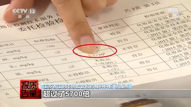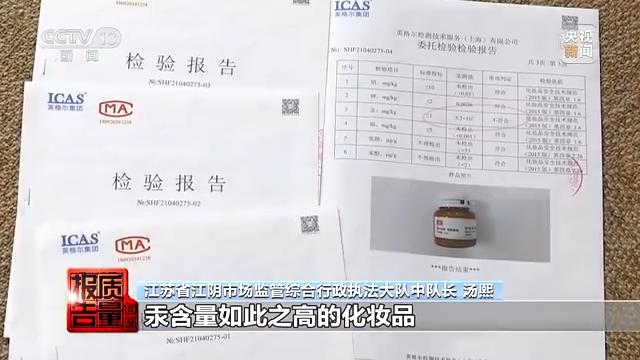 消费者提供的检测报告显示,这款产品汞含量超标10000多倍,执法人员对这款产品的快速检测结果也显示汞含量超标。