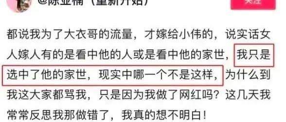 【小花妈妈】:在朱小伟的第一段婚姻中,年长他3岁的陈亚男是大衣哥亲自挑选的儿媳妇,俩人的婚礼备受瞩目,陈亚男辞掉了原来的护理工作,转向网红领域。在大衣哥朱的流量加持下,陈亚男凭借带货赚得盆满钵满,还开起了自己的个人工作室,投资影视公司。