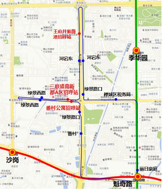 途经站点:丽日豪庭-禅城区税务局-绿景路口-河宕东-王府井紫薇港招呼站-河宕东-三联盛南新都A区招呼站-绿景西路(北)-绿景西路(南)-番村公寓招呼站-绿景路口-番村-丽日豪庭