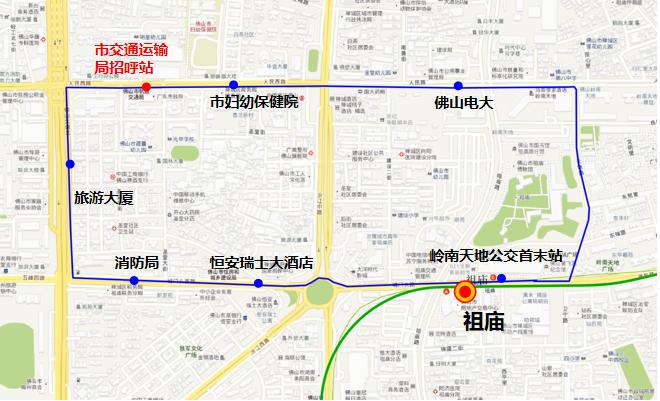 途经站点:岭南天地公交首末站-恒安瑞士大酒店-消防局-旅游大厦-市交通运输局招呼站-市妇幼保健院-佛山电大-岭南天地公交首末站