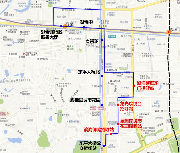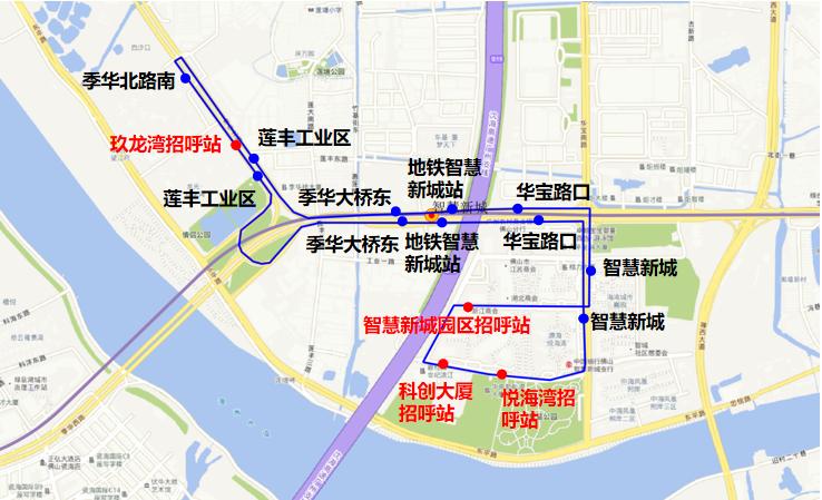 途经站点:季华北路南-玖龙湾招呼站-莲丰工业区-季华大桥东-地铁智慧新城站-华宝路口-智慧新城-悦海湾招呼站-科创大厦招呼站(暂不停靠)-智慧新城园区招呼站(暂不停靠)-智慧新城-华宝路口-地铁智慧新城站-季华大桥东-莲丰工业区-季华北路南