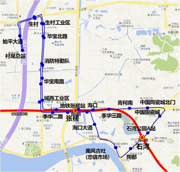 途经站点:村尾总站-始平大道-生村-生村工业区-华宝北路-消防特勤队-华宝南路-城西工业区-季华二路-地铁张槎站-海口-海口大道-南风古灶(忠信市场)-陶都-石湾公园-中国陶瓷城-中国陶瓷城北门-青柯南-季华三路-海口-地铁张槎站-季华二路-城西工业区-华宝南路-消防特勤队-华宝北路-生村工业区-生村-始平大道-村尾总站