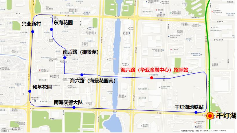 途经站点:千灯湖地铁站-南海交警大队-和基花园-兴业新村-东海花园-南六路(御景苑)-海六路(海景花园南)-海六路(华亚金融中心)招呼站-千灯湖地铁站