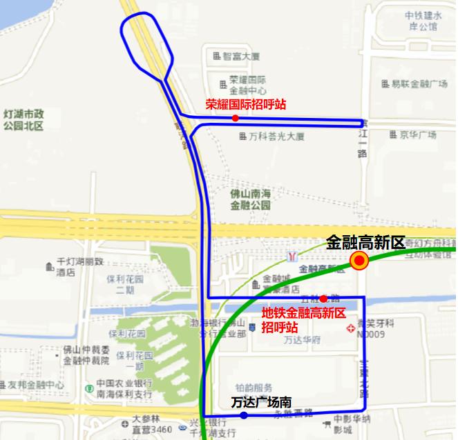 途经站点:地铁金融高新区招呼站-荣耀国际招呼站-万达广场南-地铁金融高新区招呼站