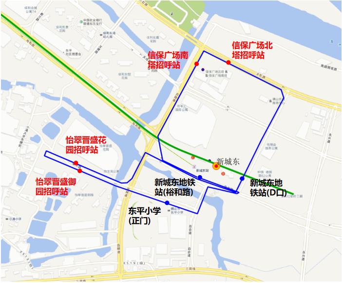 途经站点:新城东地铁站(裕和路)-信保广场南塔招呼站-信保广场北塔招呼站-新城东地铁站(D口)-怡翠晋盛花园招呼站-怡翠晋盛御园招呼站-东平小学(正门)-新城东地铁站(裕和路)
