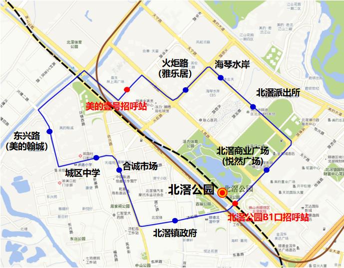 途经站点:北滘公园B1口招呼站-北滘商业广场(悦然广场)-北滘派出所-海琴水岸-火炬路(雅居乐)-美的壹号招呼站-东兴路(美的翰城)-城区中学-合诚市场-北滘镇政府-北滘公园B1口招呼站