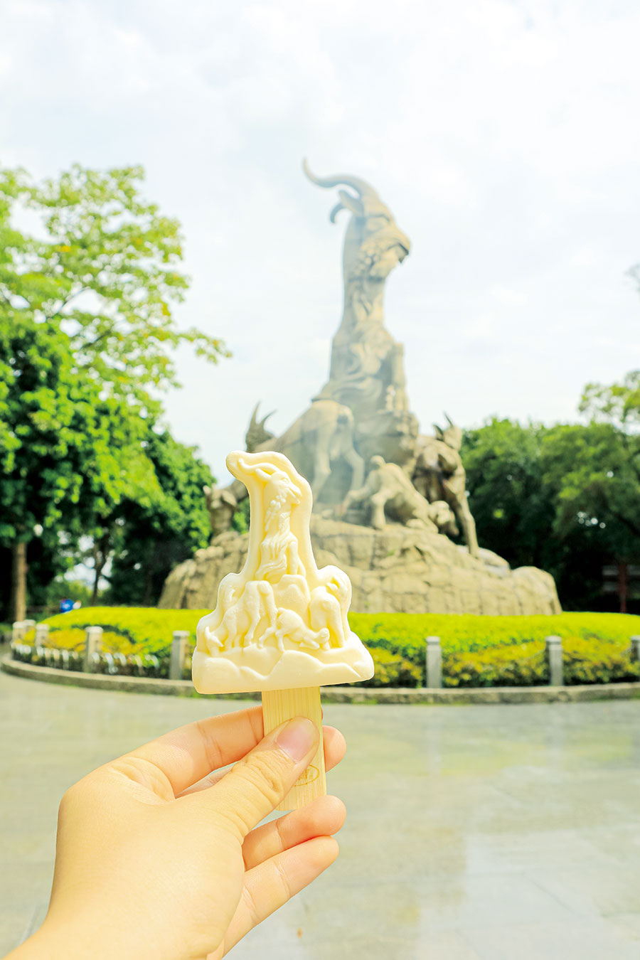 位于越秀公园的木壳岗上的五羊石像,是广州的标志性建筑物,曾作为广州亚运会的会徽闻名亚洲。这座石像,高达11米,体积达53立方米,雕刻着五头栩栩如生的山羊。走近一看,每只山羊,形态各异,大小不一。最高的头羊口衔谷穗,雄劲老成地昂首前方。其余四羊环绕在头羊周围,或戏耍,或吃草,亲密依偎,体现出友爱、祥瑞。这款雪糕以五羊石像为造型,通过“复制粘贴”,成功打造出这款“祥瑞献穗”文创雪糕。“祥瑞献穗”背后,有着五羊仙子的故事。传说在广州连年灾荒,人民不得温饱时,天空出现了五朵彩色祥云,上有五位仙人,分别骑着五头山羊,羊口衔着优良稻穗,飞临广州,给广州人民带来福泽。举起“祥瑞献穗”文创雪糕和五羊石像合照,希望能带来更多的福气。
