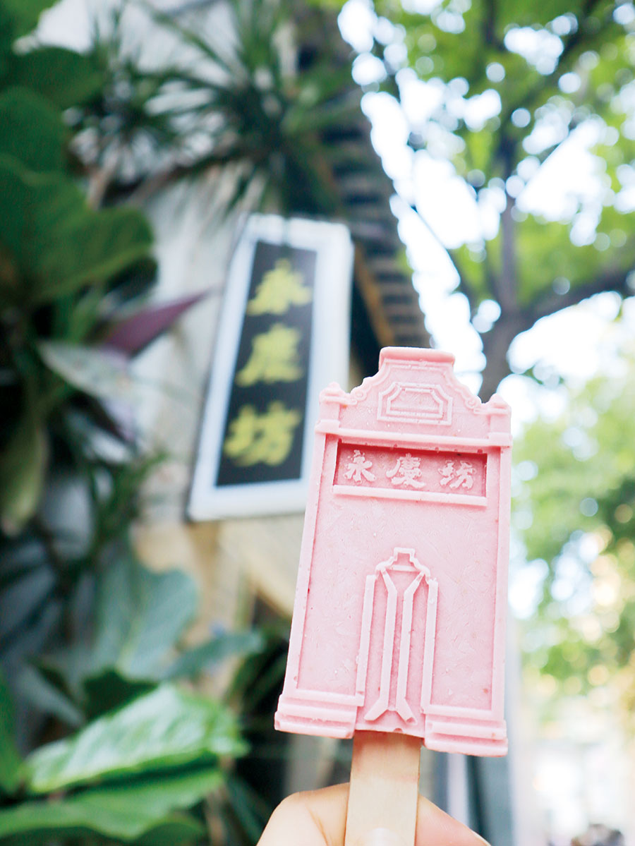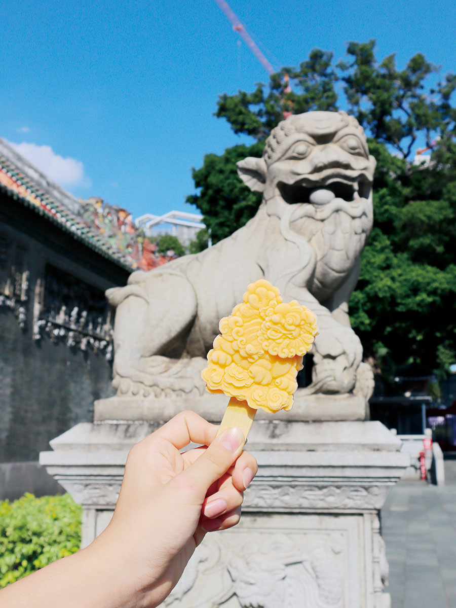 陈氏书院,俗称“陈家祠”,由大小十九座单体建筑组成,被誉为“岭南建筑艺术明珠”。陈家祠从上至下,从外到里,所有的堂、院、廊、厅、门、窗、栏杆、屋脊等,都大量地使用了石雕、木雕、砖雕、陶塑、泥塑、铁铸等方式加以装饰。游览于陈家祠,会发现这里的每块石头、砖瓦、木块,所雕刻出的飞禽、走兽、人物、瓜果,都栩栩如生,仿佛拥有着独特的生命力。陈家祠里的文创雪糕,是“独角狮”的造型,雪糕雕刻下的“独角狮”,也显得栩栩如生。“独角狮”是岭南建筑独有的建筑装饰物,它广泛装饰于山墙垂脊前沿上,全身朱红色,独角,状若凌空而下,气势雄伟。根据民间传说,“独角狮”造型的由来,是通过“以怪制怪”的方式创造,为老百姓辟邪保平安。