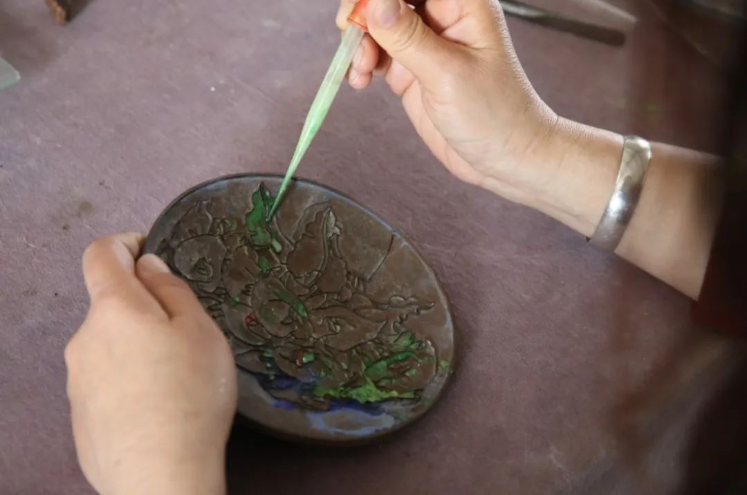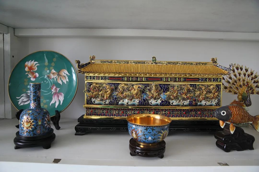 景泰蓝的学名是“铜胎掐丝珐琅”,它的传神与生动更多在于花纹细节与色彩。马国庆、何爱莲夫妇将各自擅长的传统技艺有机结合,一步一步将设计构想变为现实。“我们现在为大家呈现的景泰蓝作品,集‘景泰蓝’与‘花丝镶嵌’两项工艺于一体,这是我们的创新之处。相比于传统作品而言,我们的作品融合瓷器、青铜器等中国元素,近年来,在政府的帮助扶持下,我们经常外出参展,更加注重迎合市场需求,作品不拘泥于传统元素,更结合当下的时尚元素,让景泰蓝真正走进百姓家中。”马国庆介绍道。