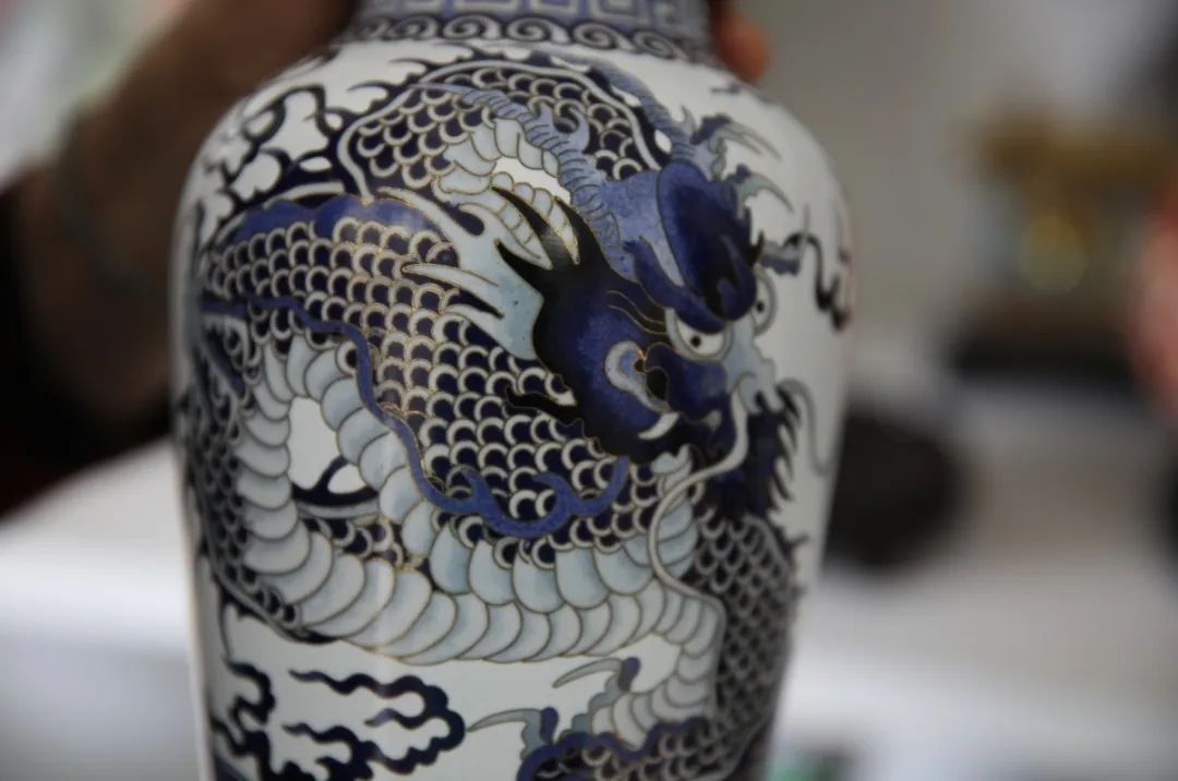 皇家艺术品精工细作、不计成本,工匠们积年累月,只为精心打磨一件珍品。马国庆、何爱莲夫妇将精益求精的创作热忱倾注于每一件作品中。“景泰蓝的制作工期大概为三年,历经掐丝、点蓝、烧焊、磨光、镀金等108道工序,由于结合了更为复杂的花丝镶嵌工艺,每一步操作都必须极其仔细,若失之毫厘,则前功尽弃。比如,景泰蓝制作中有一道烧结工艺,每件产品最少要经过十几次火中考验,对时间和温度的掌握都要求很精确。”何爱莲一边展示“难度系数”最高的景泰蓝纹龙瓶,一边介绍说。景泰蓝纹龙瓶是一件将传统与创新相结合的艺术品,作品似青花瓷又非青花瓷,表面平滑光亮,色彩自然饱满,很难让人相信这是由景泰蓝和花丝镶嵌工艺烧焊、粘嵌结合而成。