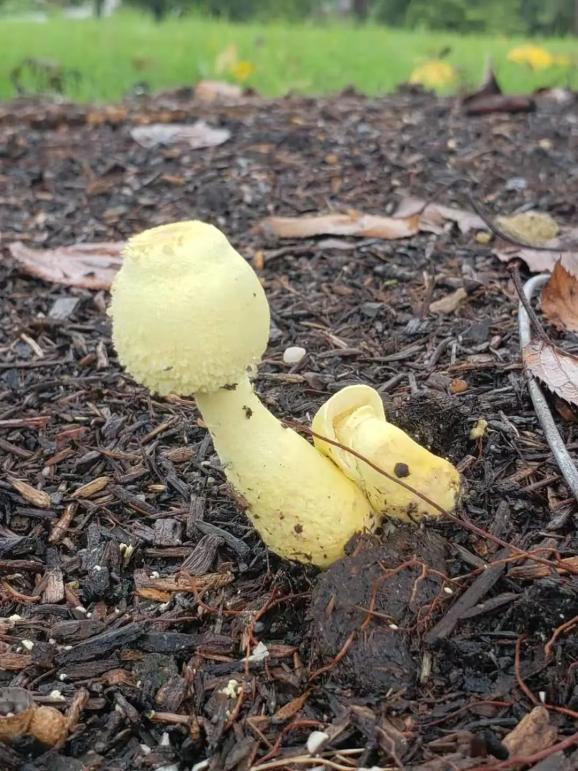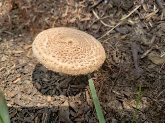 由于公园内栽培土含有丰富的腐殖质,很适合大青褶伞地下菌丝的生长,但8月份的高温对其生长有一定的抑制。而目前回落的气温和降雨则给予了它良好的生长环境,因此纷纷破土而出。 公园内最常见的蘑菇有大青褶伞,属伞菌目、蘑菇科、青褶伞属。