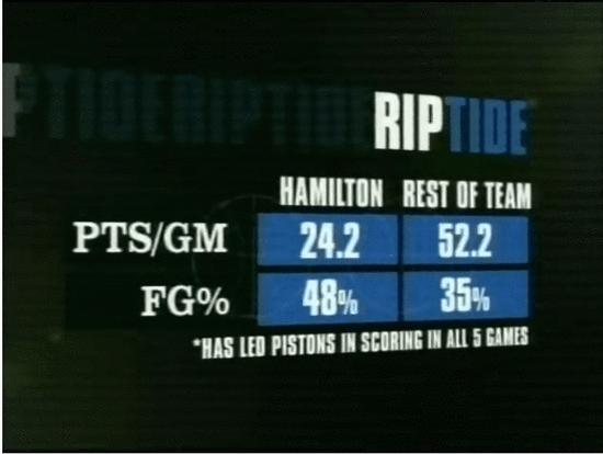 在这里可以提一下汉密尔顿在团队中的作用,很多人觉得他不过是活塞这个防守球队里的终结者,其实远不止这么简单。对于重视肉搏的活塞来说,跑动中的汉密尔顿正是那个制造移动的人。正因为有他无休止的无球跑动,把对方的防线和换防布置全部打乱,才能把局面活泛起来(多年以后的库里则将这种效应彻底放大,变成了“库有引力”)。