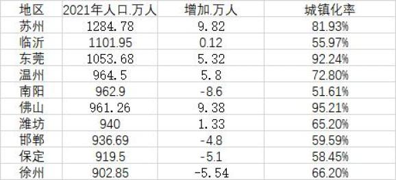 其中苏州、临沂和东莞超过1000万人,温州超越南阳升至第四,潍坊超过邯郸上升至第七。