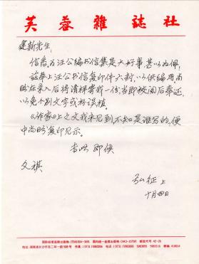我下旬将应《钟山》太湖笔会之邀到苏州、无锡一带玩一趟。回来即将编我的第二本小说集。此集为应人民文学出版社之约编的。书名《晚饭花集》,收小说十七篇。十月底交稿,出书至早也在明年夏天了。书出,当请指教。编完小说集将着手搜集我的评论和散文。这也颇费事,因为我的东西发表后都未剪留,只记得篇名,连刊在哪个刊物哪一期都不记得,即使复印,也极麻烦。散漫成性,麻烦自找也!