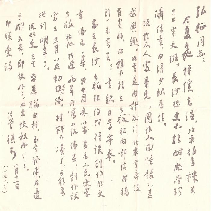 前在长沙,出版社约我将谈创作的文章编为一集。我十月底以前要为人民文学出版社把我近两年所写小说编集,创作谈需在十一月以后动手编。材料不凑手,可能要拖到明年了。