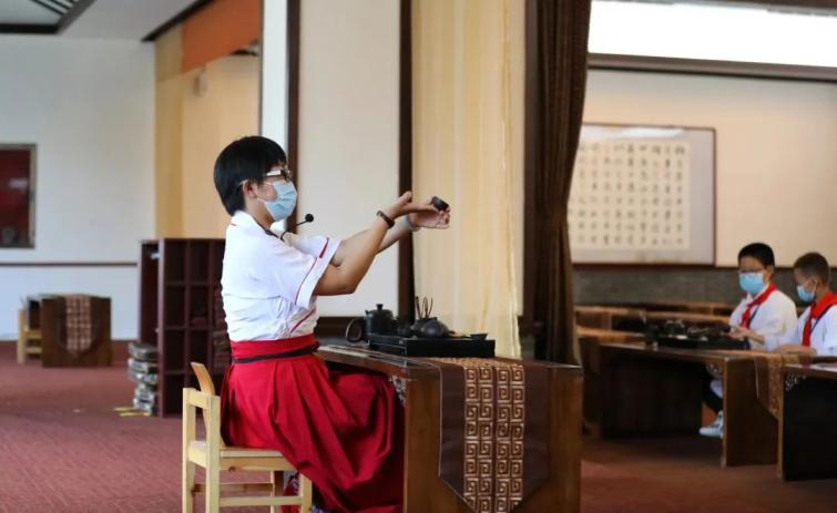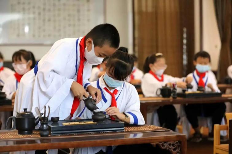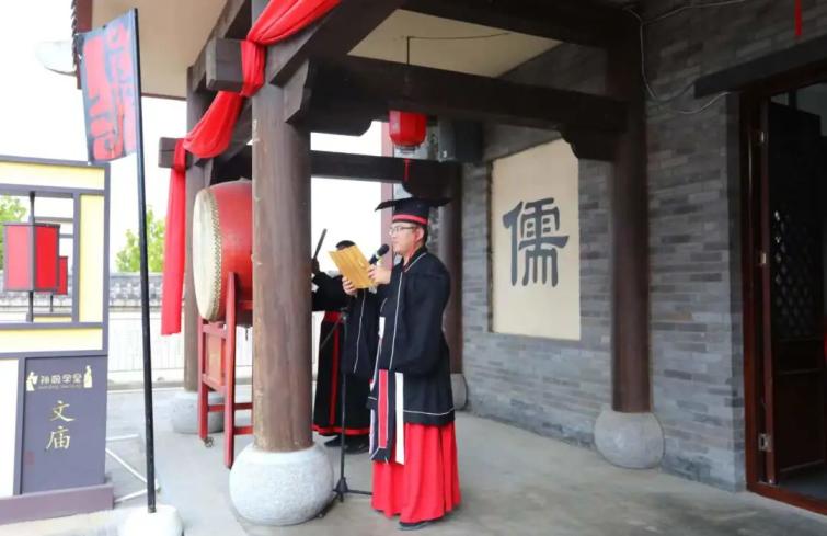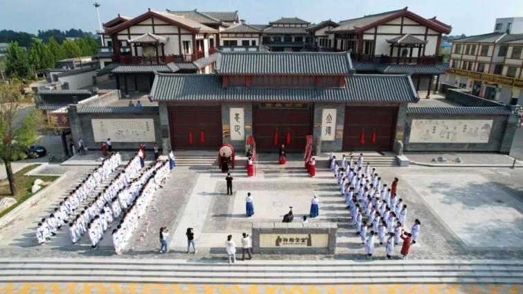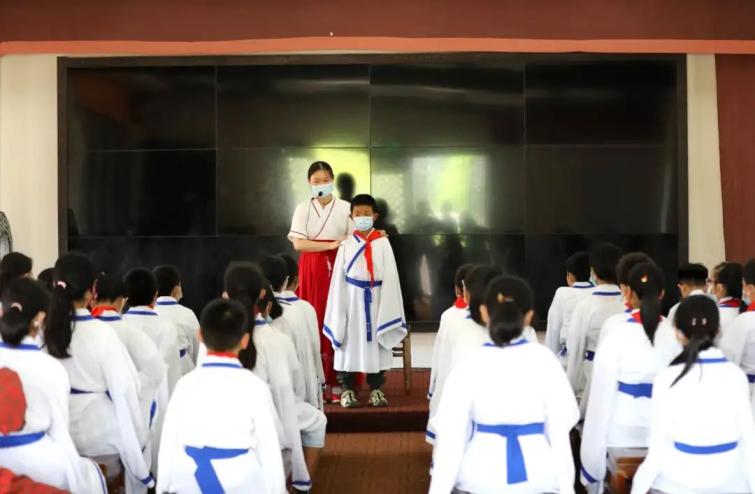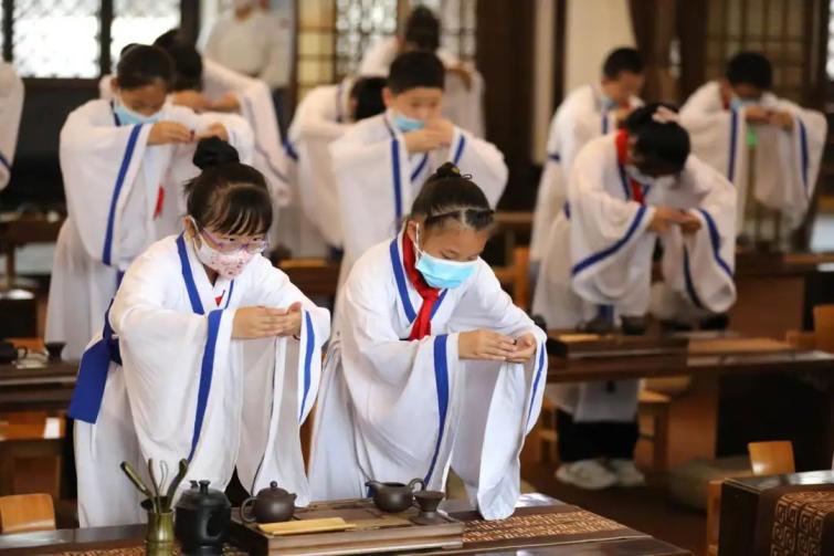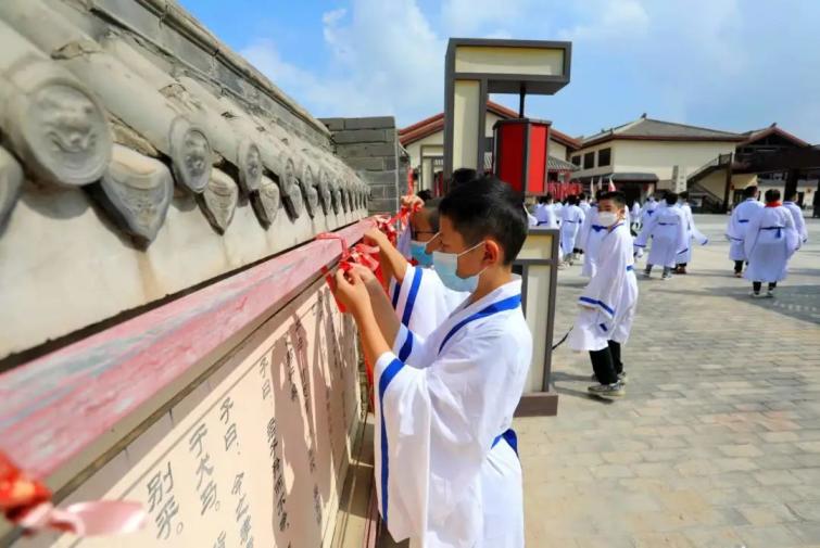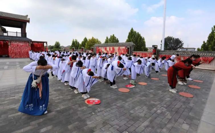 伴着悠扬的编钟声,身着统一汉服的孩子们整齐排列在广场上,张开双臂、身体微探,有模有样地行朝阙礼,如同从雄汉盛唐穿越而来。随后,大家缓缓踏上六艺大道,先后走进焕然一新、高大宏伟的一庙(文庙)三堂(容礼堂、知礼堂、明孝堂)。研学导师们认真细致地为孩子们讲授朝阙礼、拜师礼、敬茶礼、衣冠礼,在一举一动、一言一行间传递传统文化的魅力。