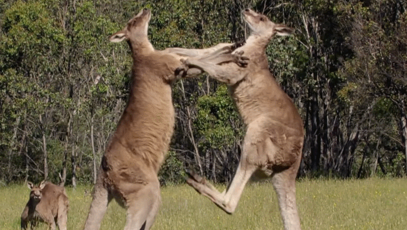 年轻的雄性袋鼠会前来挑衅,甚至跟 old man 打上一架,这有助于年轻雄性了解自己在种群里的地位,也是为了争夺优先择偶权。