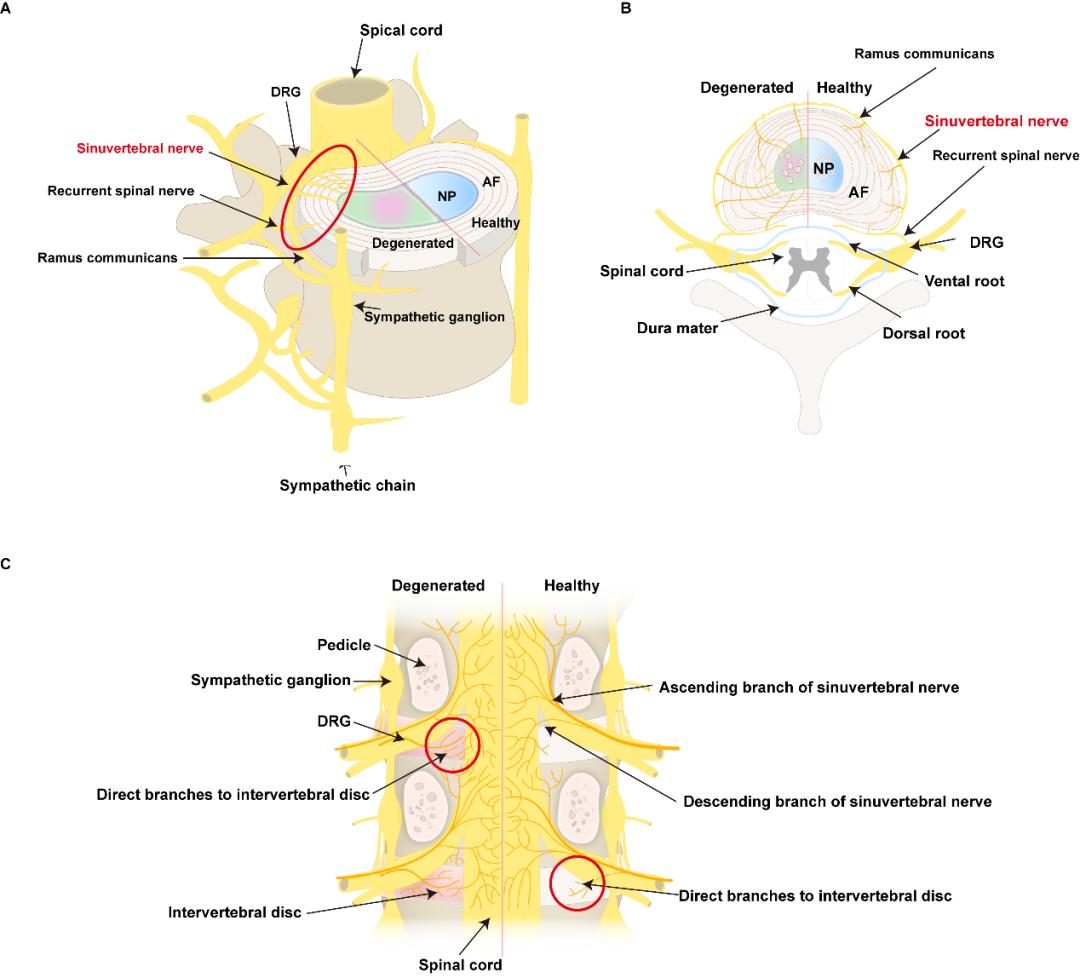 正常的椎间盘是无神经的和无血管的,然而在退变的椎间盘组织内部存在不同类型的神经纤维,可能在椎间盘源性疼痛的产生中起关键作用(如下图)。椎间盘的支配神经主要是是窦椎神经,其主要由脊神经腹侧支的体节分支和灰色交通支的交感神经节后支组成,具备本体感觉和疼痛感受双重功能。窦椎神经可以接收或传输来自椎间盘的机械和化学刺激,所有这些信号将被传输到相应的背根神经节或交感神经节,导致SP和CGRP等神经递质的产生和转运增加,进入相应水平的脊髓或通过轴突返回椎间盘。在中枢神经系统,参与椎间盘调控的主要是下丘脑腹内侧核(VMH)和室旁核(PVN),从而建立椎间盘-背根神经节/交感神经-VMH/PVN调控轴。