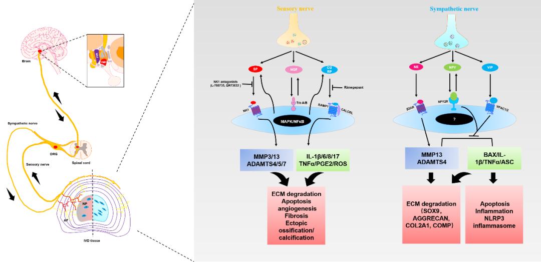 因此,研究团队提出椎间盘退变新理论:受多种因素影响,如神经营养因子和机械力等,分布在纤维环外层的神经纤维会渗透到盘内层组织中,释放神经递质。这些神经递质会逆向激活背根神经节和交感神经节内的相应神经元,通过脊髓突触传递到中枢神经系统, VMH和PVN。在VMH和PVN的控制下,椎间盘内部的神经支配将得到加强,释放的各种神经递质(SP, CGRP, NPY, VIP, 和NE等)可通过其受体直接影响椎间盘细胞的功能(如下图)。