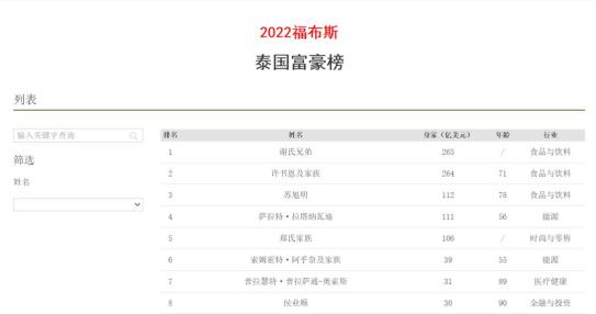 如今,谢氏家族的正大集团,迄今已经有101年历史。2022年泰国福布斯富豪榜上,正大集团“谢氏兄弟”以265美元财富蝉联泰国首富。多年来,“谢氏兄弟”也一直稳居该榜第一。