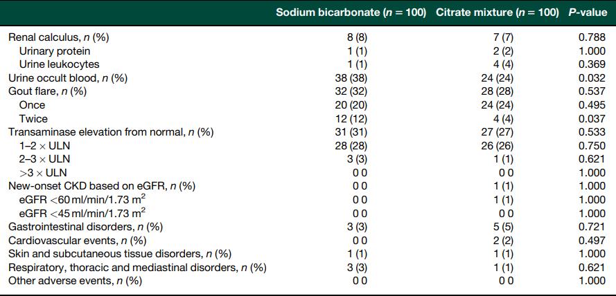 另一项对182例受试者观察了12周的对照试验显示:枸橼酸氢钾钠与碳酸氢钠碱化尿液作用无差异;枸橼酸氢钾钠在降低尿潜血,减少痛风发作方面有优势;而标准的尿pH值检测方法有待确定[8]。
