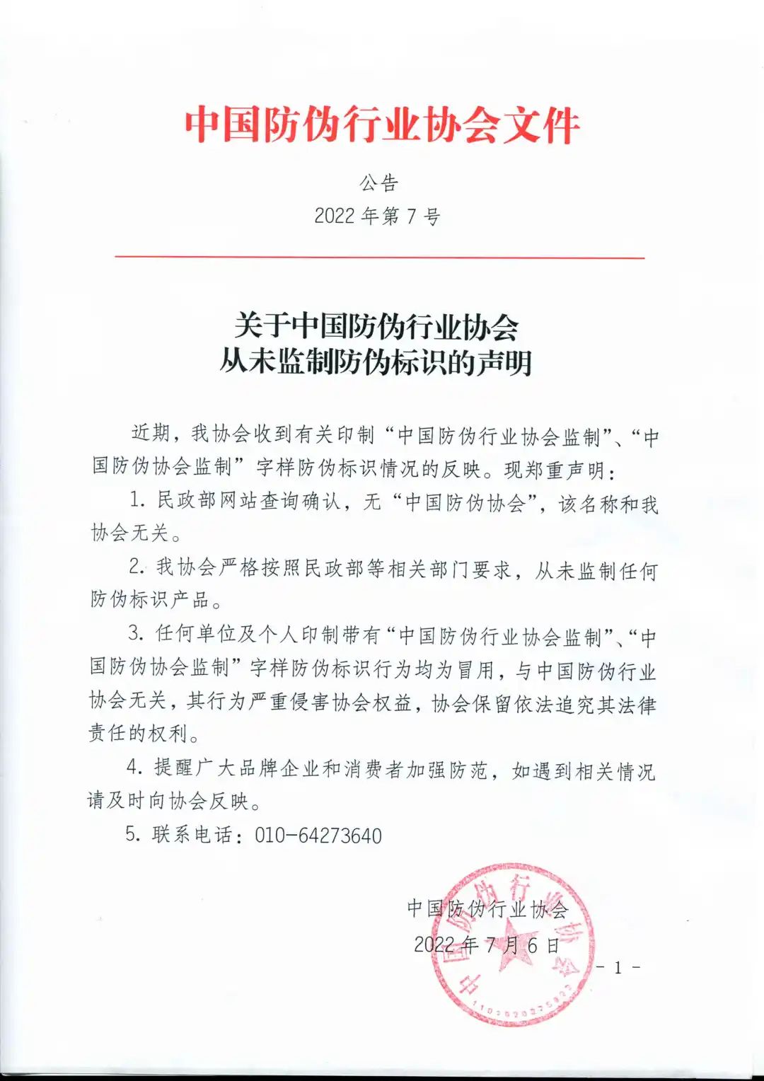 而且关于防伪信息冒用的问题,中国防伪行业协会还专门在今年 7 月正面回应过:协会从未监制防伪标识。