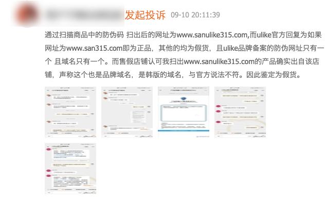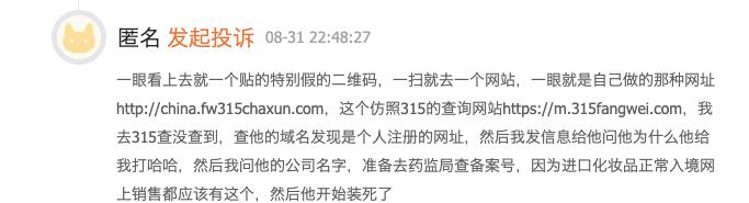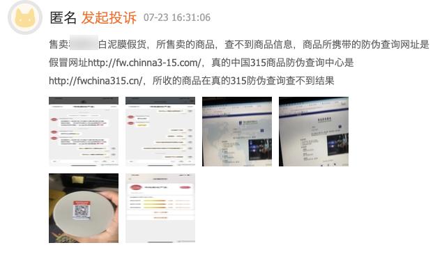 像这个投诉的老哥,虽然识别出假冒的 315 防伪网址,却又把另一个假冒的 315 防伪网址当成真的防伪查询中心了。