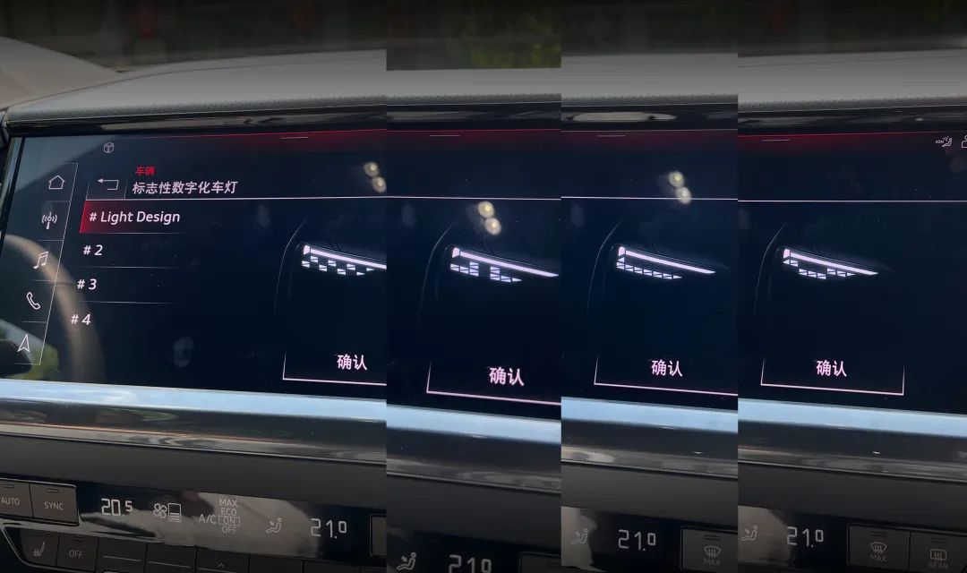 日间行车灯分为上下两层的样式,上层为固定的匀光灯条,下层奥迪则提供了自定义选项,使用两行共 16 颗,组合形成 4 种不同的造型。相比常规的车灯设计,可自定义灯组显得非常亮眼。