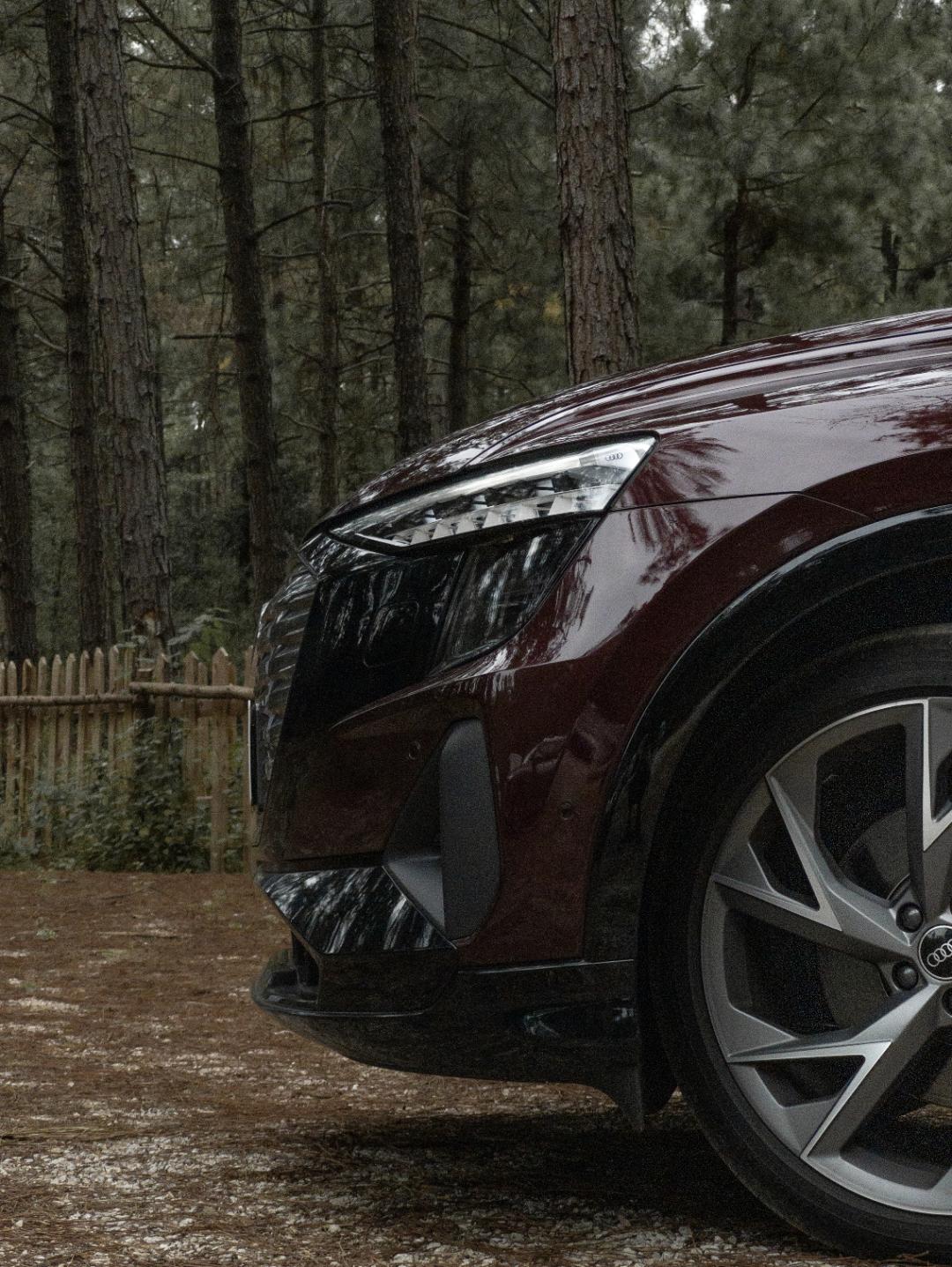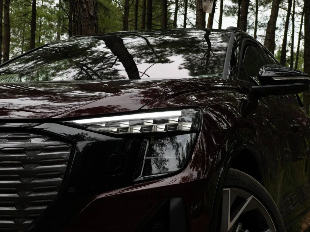 我们试驾的车型是 50 e-tron quattro 机甲套装版本,车漆颜色是「干将红」的车漆,相比其他颜色,这个颜色会给人一种沉稳和典雅的感觉。尤其是在山间密林中,深暗的底色和多涂层工艺配合头顶树叶丰富的反射,让这个车漆显得格外有质感。
