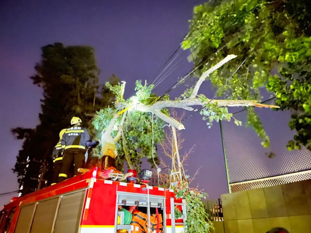 9月22日晚21时50分许,受灾害性天气影响,海淀区消防救援支队五棵松特勤站接到报警求助:海淀区万寿路西街某学校南门口,一棵大树被狂风刮断压在高压电线上,导致附近300多户居民和商家断电,严重影响附近居民正常生活。