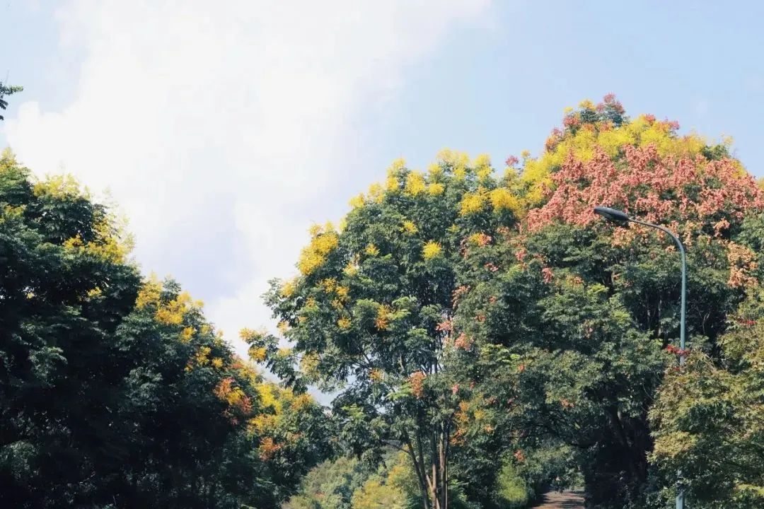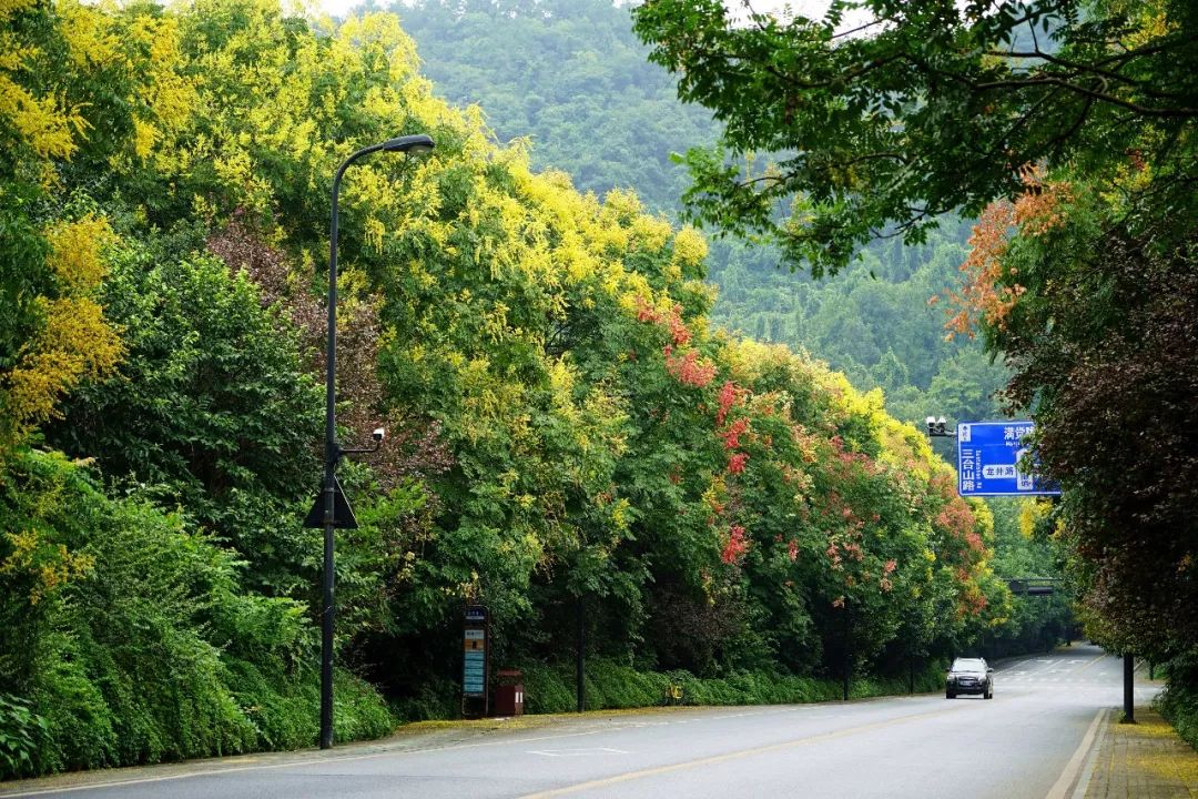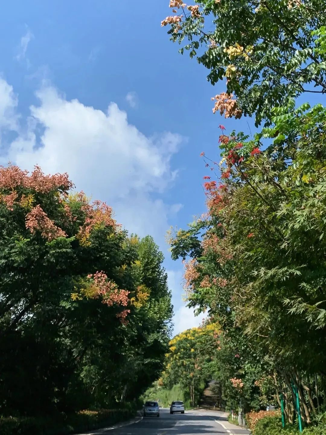 虎玉路上,成列的黄山栾树,呈现一派靓丽景象,黄花、红果、绿叶交相辉映。有人说,黄山栾树开花,意味着夏天悄悄过去,秋天正在赶来。