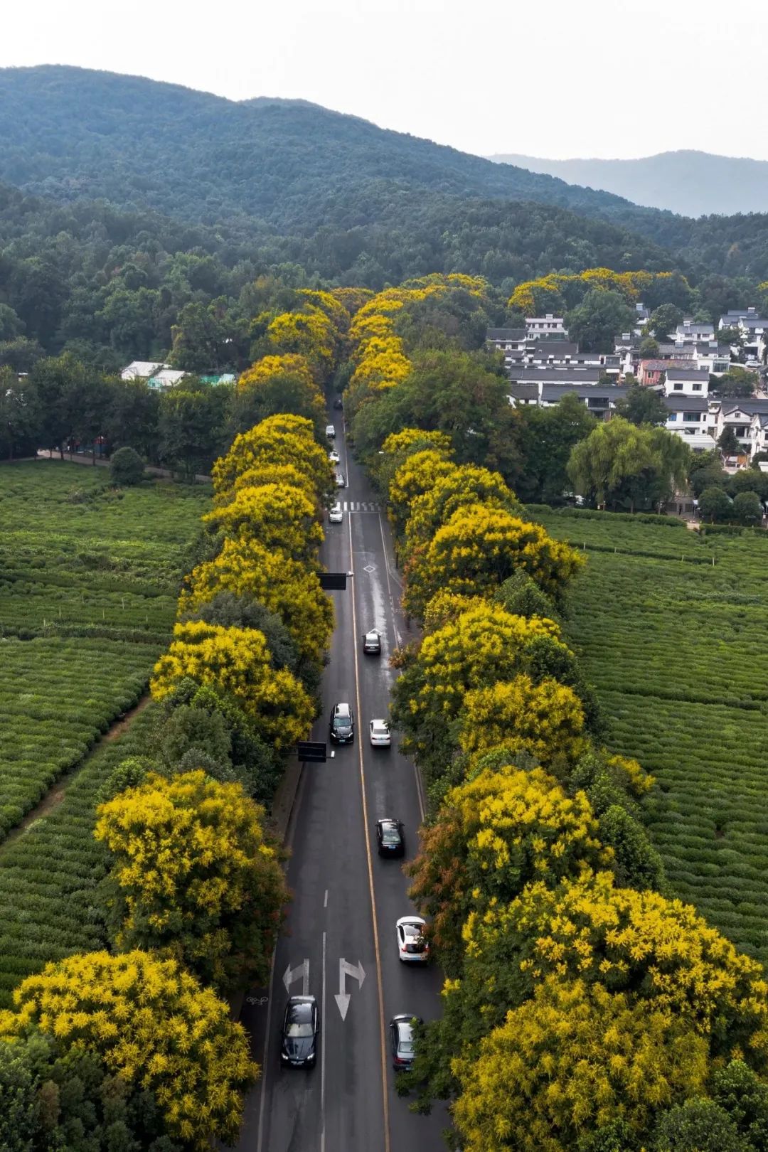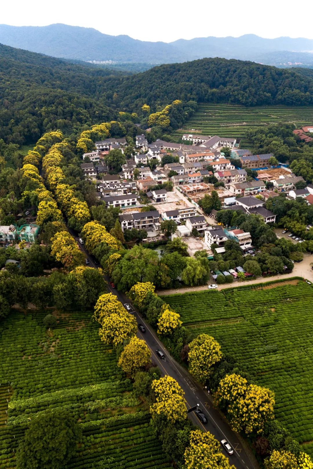 此时正是黄山栾树的最佳观赏期,杭州多条马路边的黄山栾树花开正盛,从高处俯瞰,整条路宛如黄金大道。