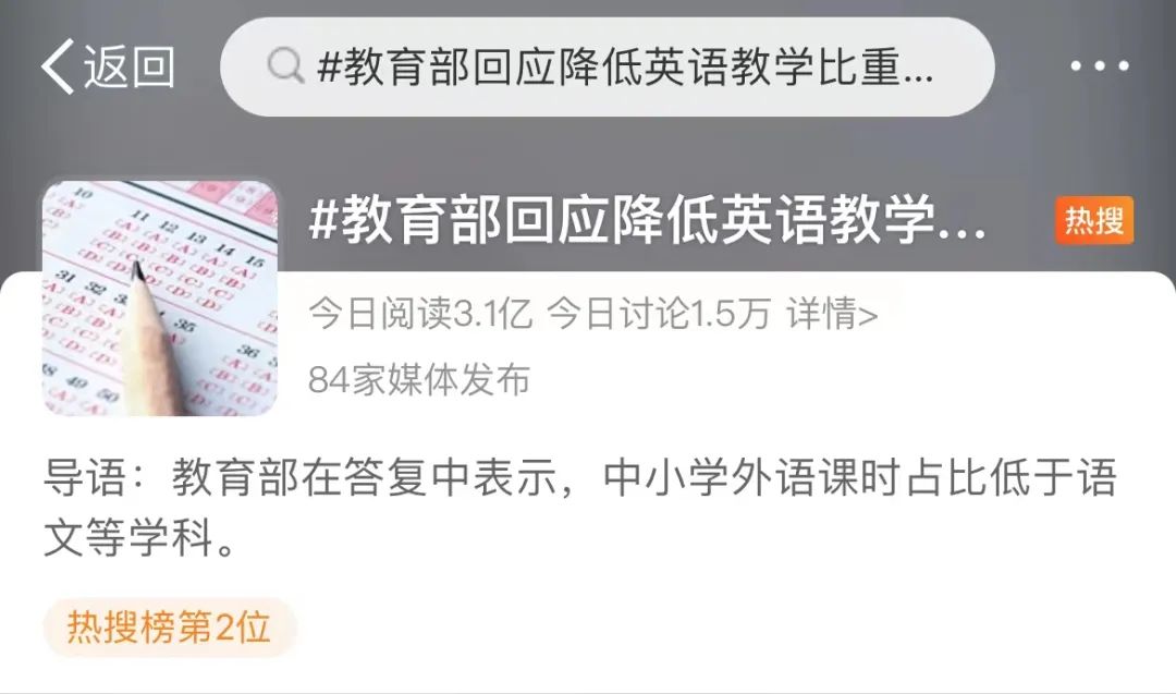 教育部在答复中表示,中小学外语课时占比低于语文等学科。
