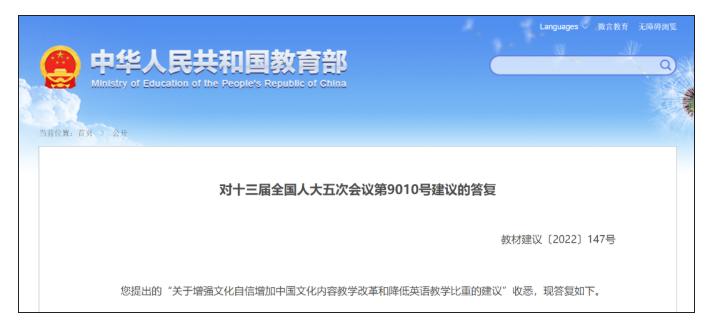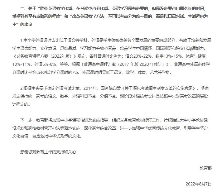 教育部在答复中明确,根据中央要求确定外语考试比重。