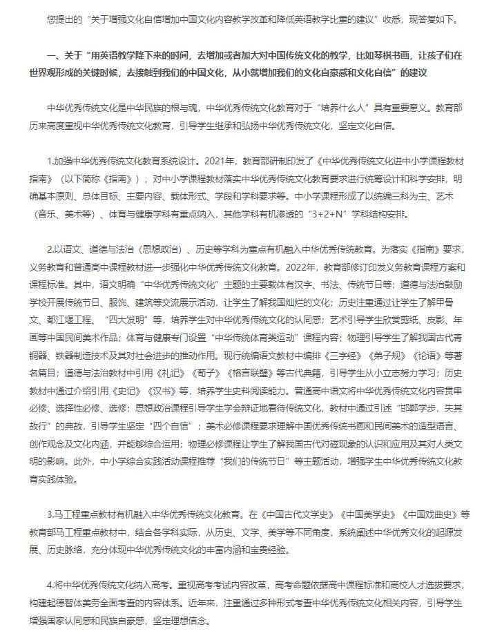 “用英语教学降下来的时间,去增加或者加大对中国传统文化的教学,比如琴棋书画,让孩子们在世界观形成的关键时候,去接触到我们的中国文化,从小就增加我们的文化自豪感和文化自信。”