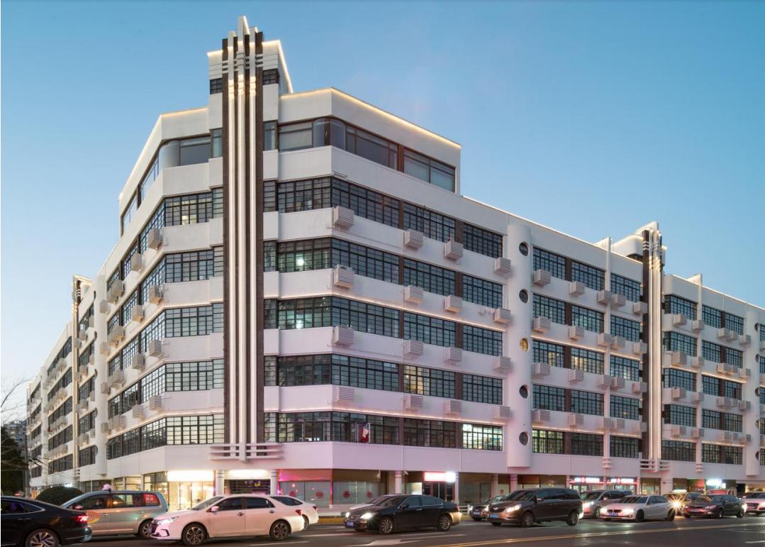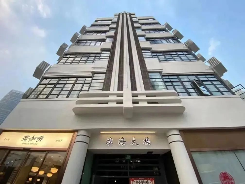 淮海大楼,原名恩派亚大楼,于1931年动工,1934年初落成,建筑采用钢筋混凝土结构,内设电梯2台。建筑中央原高6层,两翼高4层,后于20世纪80年代改建加层后分别达到7层和5层,外形仍基本保持原风格。1934年建成伊始,淮海大楼就已形成居住功能与商业功能和谐统一的风貌——底层为商铺,二层以上为公寓住宅,建筑内部装潢考究、设备齐全。