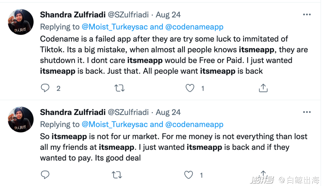 不过用户对此并不买账。目前 Codename 在 App Store 仅有 67 条评论,用户评分 2.2 分。从用户评论来看,低分的原因主要集中在 1、Codename 的产品模式在某种程度与 TikTok 有些相似,Itsme 用户无法接受自己正在使用一个仿款;2、Itsme 上的好友关系无法迁移,导致用户与不少好友失联”等两点原因。
