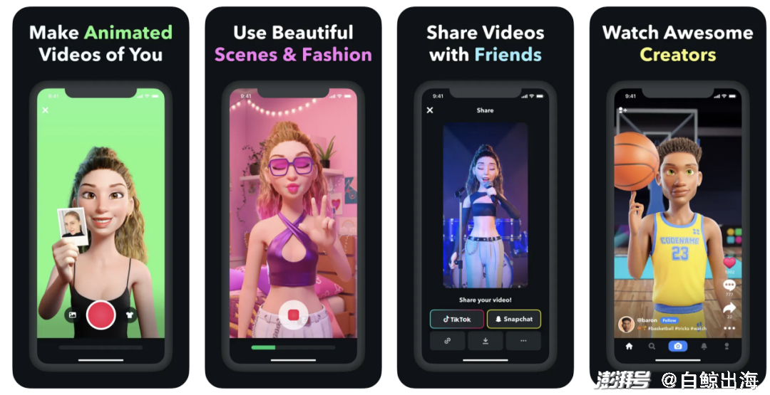 在设定完成后,用户可以选择自己感兴趣的动作以及喜欢的 Avatar 背景墙进行“合影留念”,照片可以分享至平台好友、用作头像或者保存到手机。