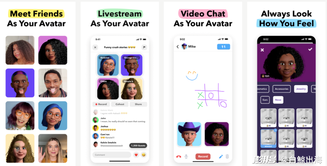 首先,当用户开放摄像头权限后,系统将通过主要捕捉用户眼睛、嘴巴和眉毛的形态生成初始 Avatar 形象,整体属于美式写实风,Avatar 表情会随用户表情实时变化。在这之后,用户可以跟自己的需求和偏好选择 Avatar 的肤色、发型、瞳孔颜色、睫毛、耳饰、眼镜以及背景颜色等,从而打造出更具个性化的虚拟形象。