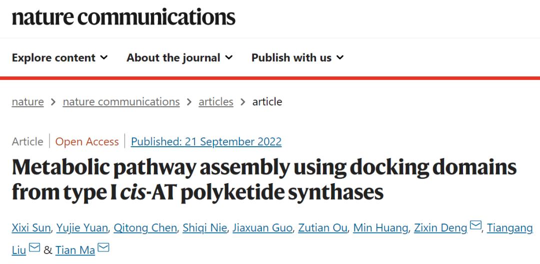 近日,中科院深圳先进技术研究院马田副研究员、武汉大学刘天罡教授团队与邓子新院士合作,在 Nature Communications 期刊发表了题为:Metabolic pathway assembly using docking domains from type I cis-AT polyketide synthases 的研究论文。