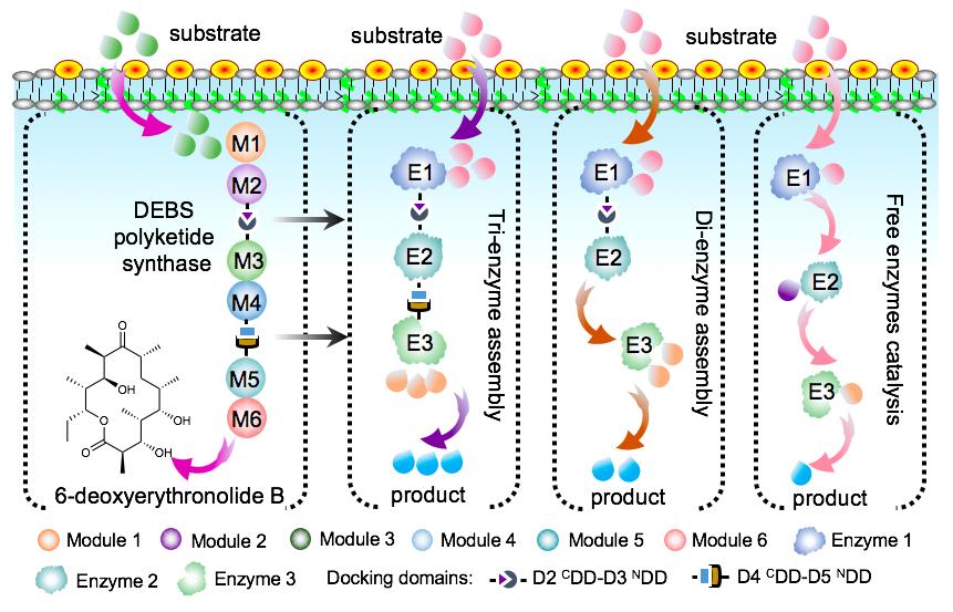 如果说微生物细胞是一个微型工厂,那么细胞内的酶就是这个工厂内的机器,这些纳米级别的机器无时不刻地催化着细胞内的多种化学反应。天然的生物催化体系通常在微生物细胞这个微型工厂内会形成物理上、空间上组织有序的多酶复合体、酶分子脚手架或者反应微区,这种类似机器组装的高度组织性带来了高效的催化能力。