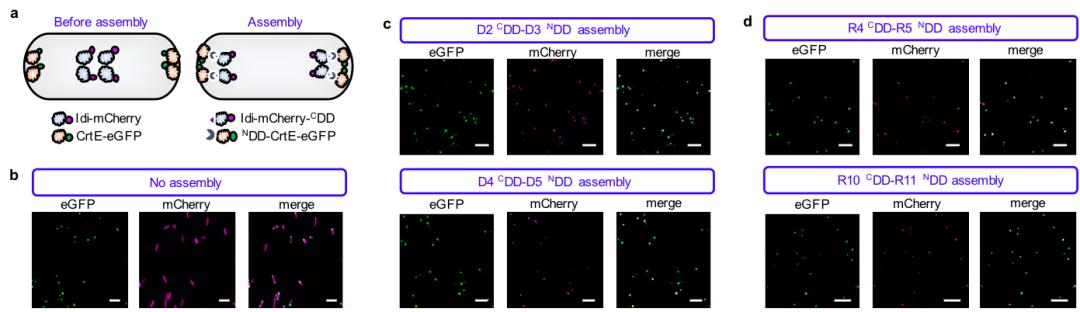 对接域的体内体外组装研究。为了验证从天然PKS系统中剥离出来的相互作用元件-对接域的识别与组装能力,本研究分别在体外和体内实验中验证了独立于聚酮合酶的对接域仍保持着良好的相互作用能力。体外实验评估了来源于红霉素聚酮合酶(DEBS)和雷帕霉素聚酮合酶(RAPS)对接域相互作用的动力学参数(图2),体内实验利用荧光蛋白的定位变化验证了对接域介导非PKS的异源酶组装能力(图3)。