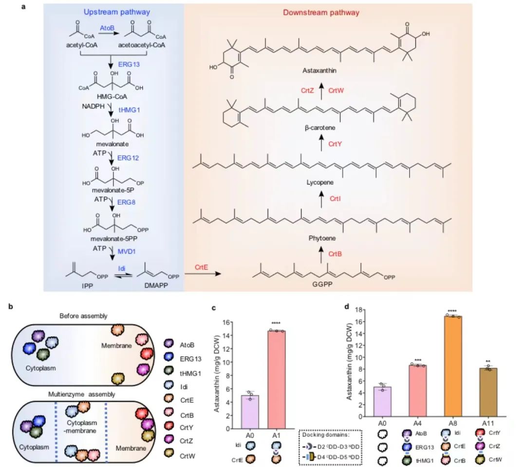 mDEBSeal策略用于虾青素代谢途径酶组装。在前期研究中,研究团队已经构建了一株虾青素高产菌株。在研究中发现,该菌株表现出代谢中间体的积累(Ac-CoA、acetoacetyl-CoA、IPP/DMAPP及beta-carotene)。因此,为了减少中间体的积累,进一步提高虾青素的产量,在本研究中,作者将源于DEBS的mDEBSeal策略用于虾青素代谢途径酶组装:将细胞内不同空间分布的虾青素代谢途径酶进行质膜酶多组合组装。结果表明,组装菌株中虾青素产量均有提高,其中在胞质-胞膜三酶组装(Idi-CrtE-CrtB)菌株A8中,虾青素产量提高了2.4倍,达到16.9 mg/g DCW(图4)。