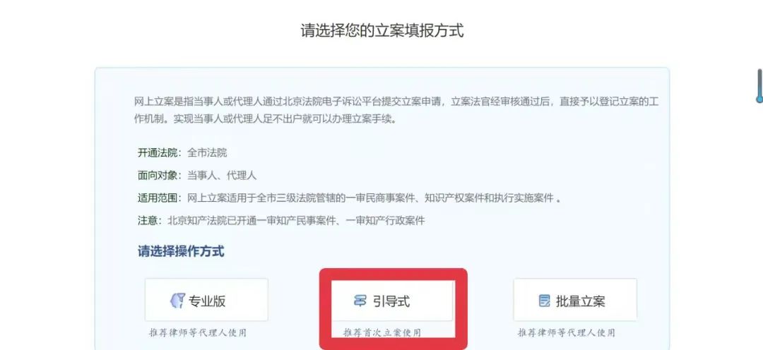 2.点击“网上立案”-“引导式”-“我作为当事人申请立案”