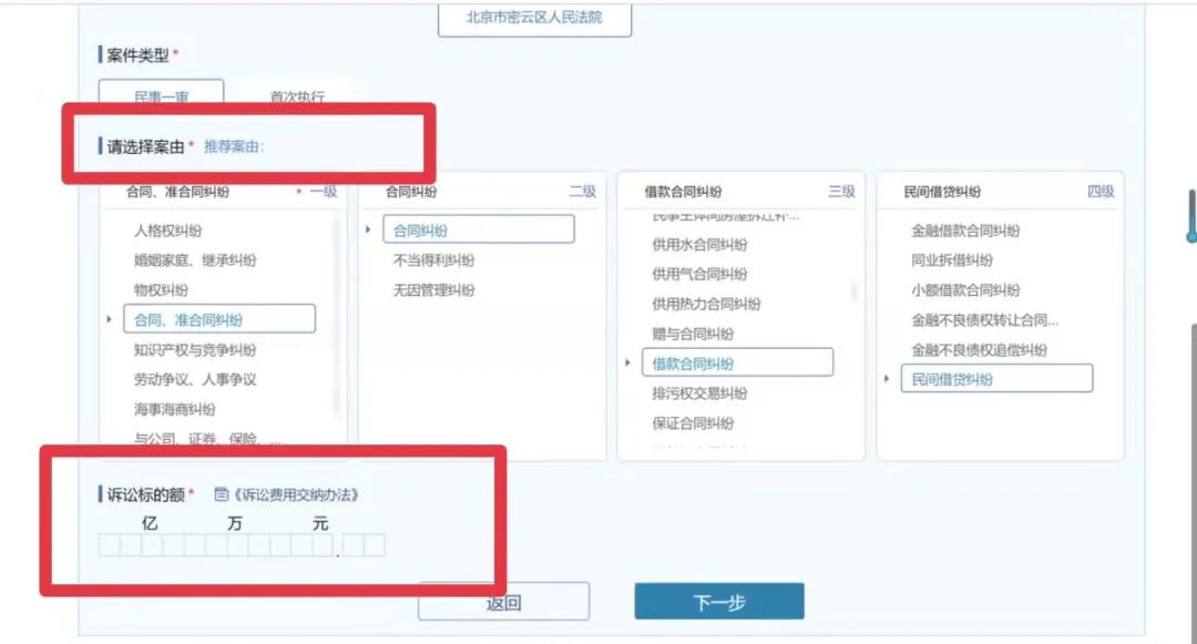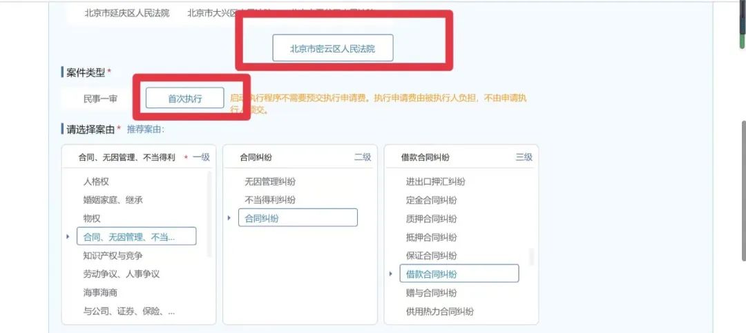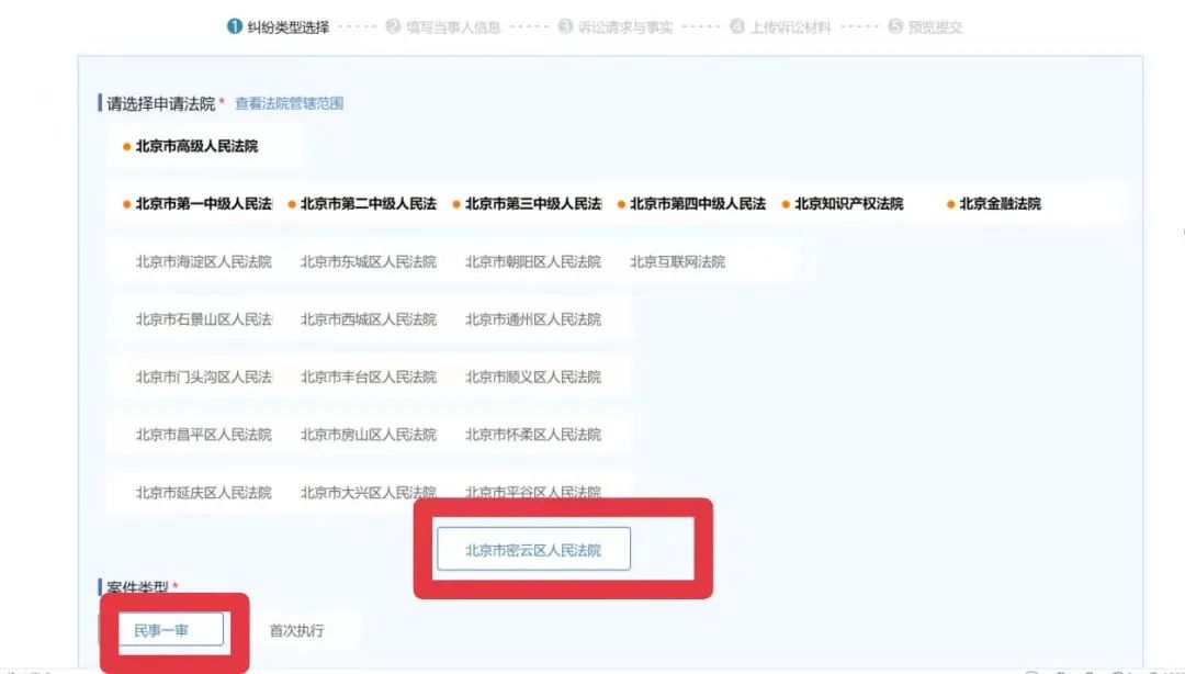 3.选择“北京市密云区人民法院”-案件类型为“民事一审”