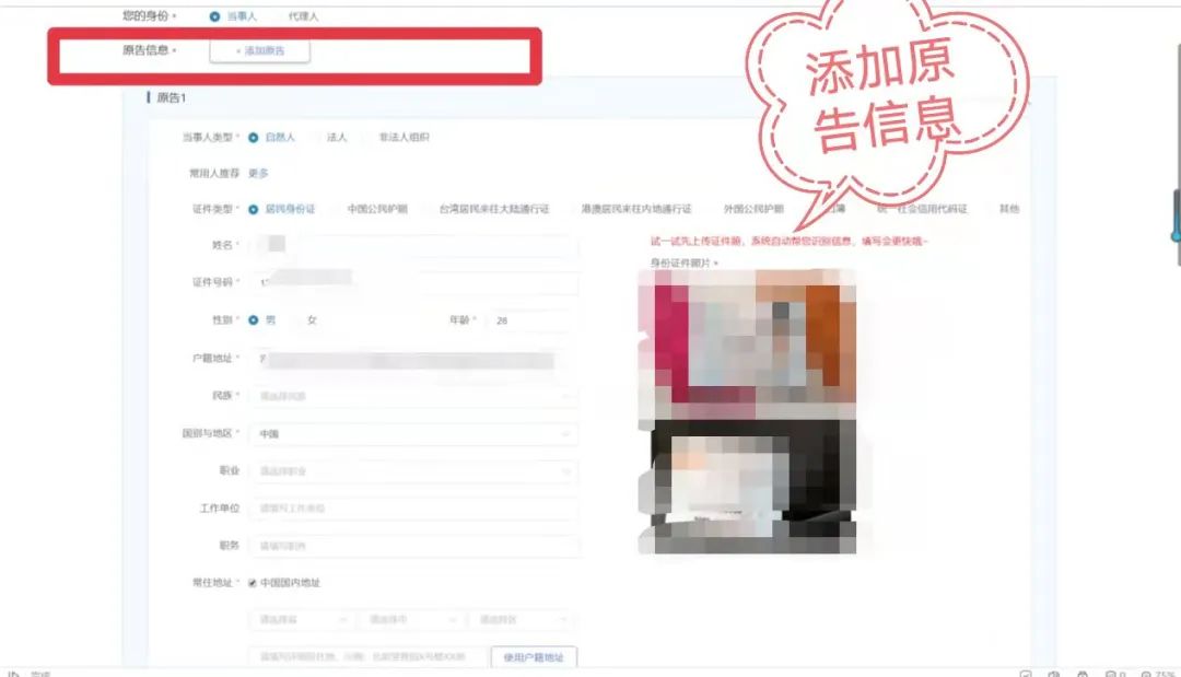 5.填写原告信息。将当事人类型、姓名、证件号码、性别、户籍地址、民族、常住地址等信息填写完整。如果有多个原告,则需要添加多个原告信息。如果有委托诉讼代理人的,则需要填写代理人信息。